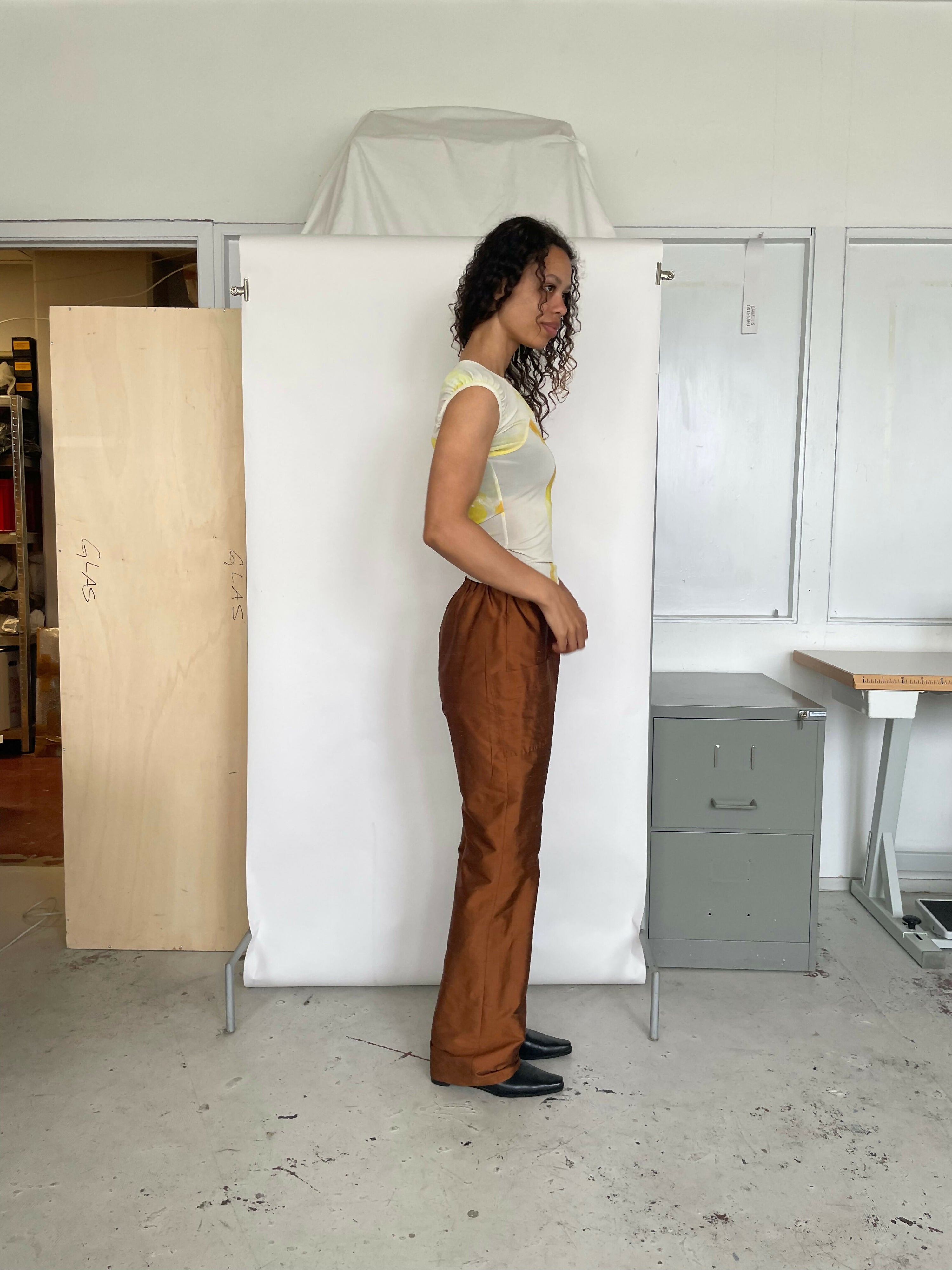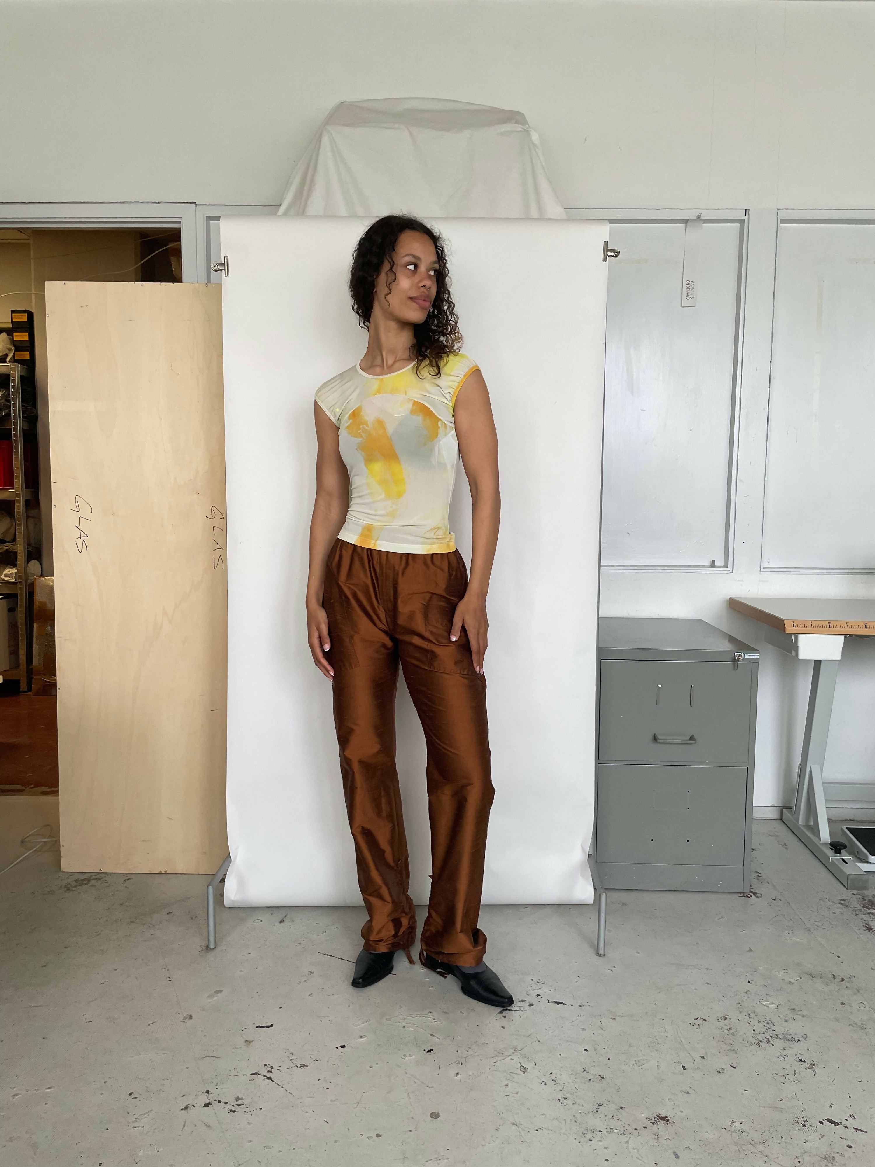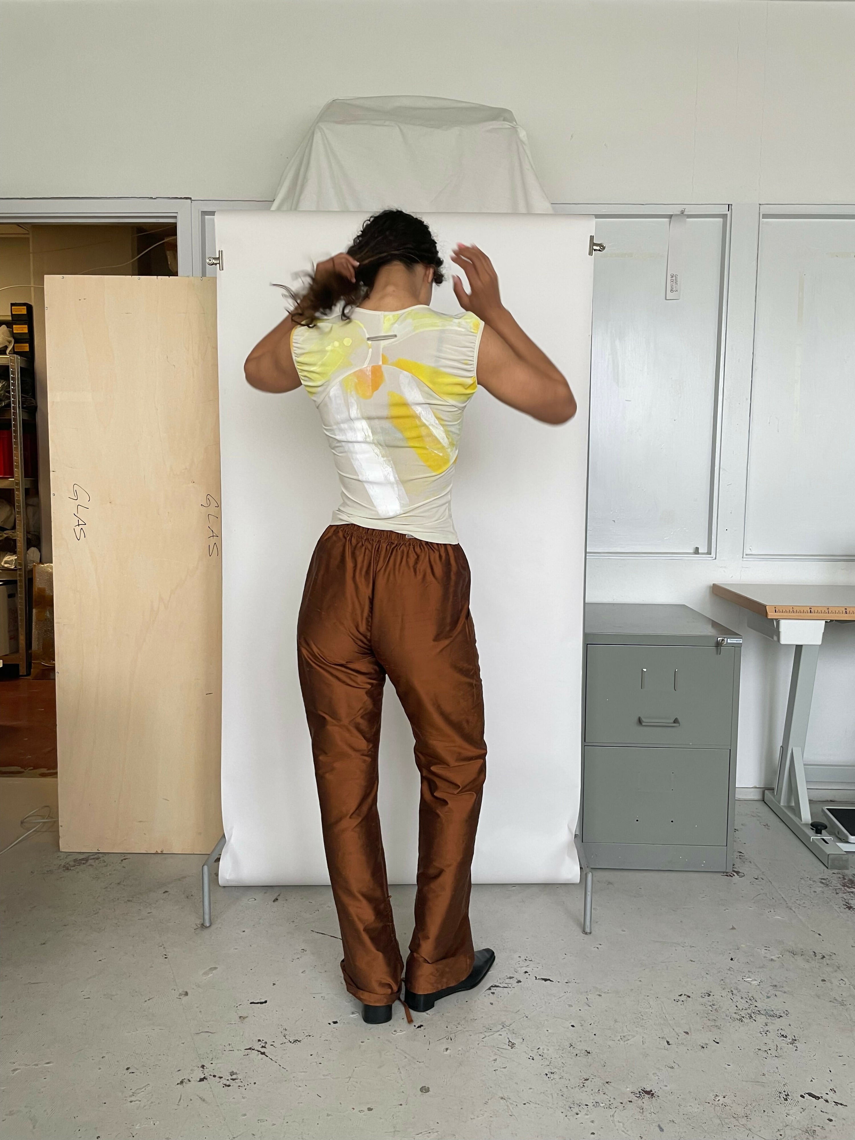 HEAT is handprinted with heat-activated ink, which brightens from orange to yellow with the warmth of the body. Each piece slightly varies in print composition due to the nature of print. The print effect is reversible and wash-resistant.