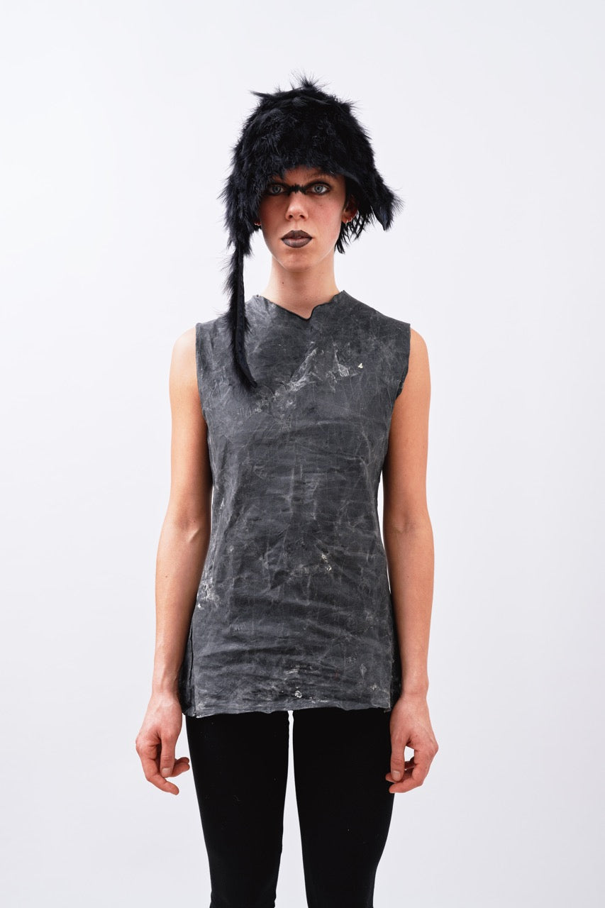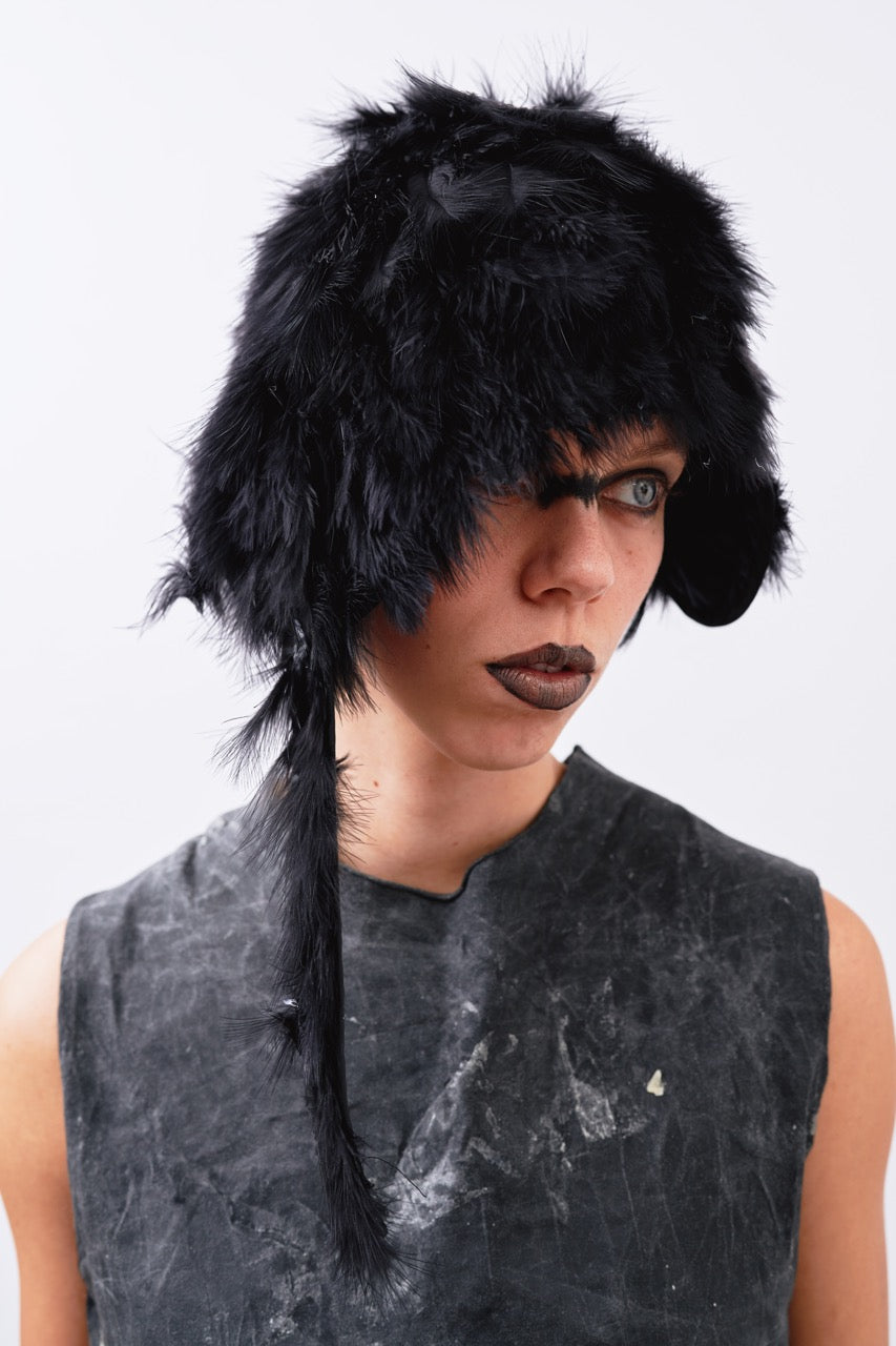 内側にパッド、外側に黒い羽根が付いたナイロン製の帽子。留め具はプッシュボタンです。