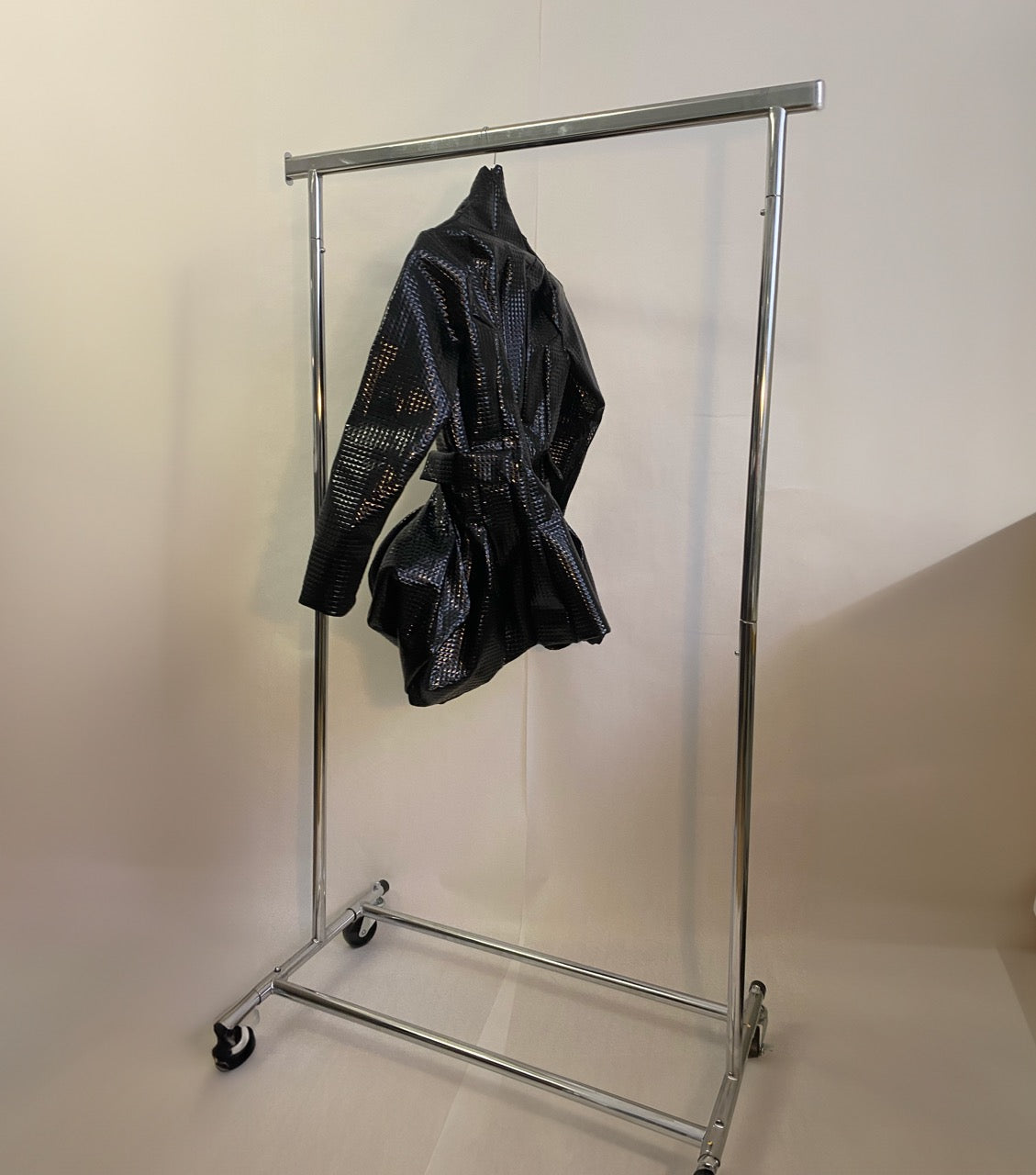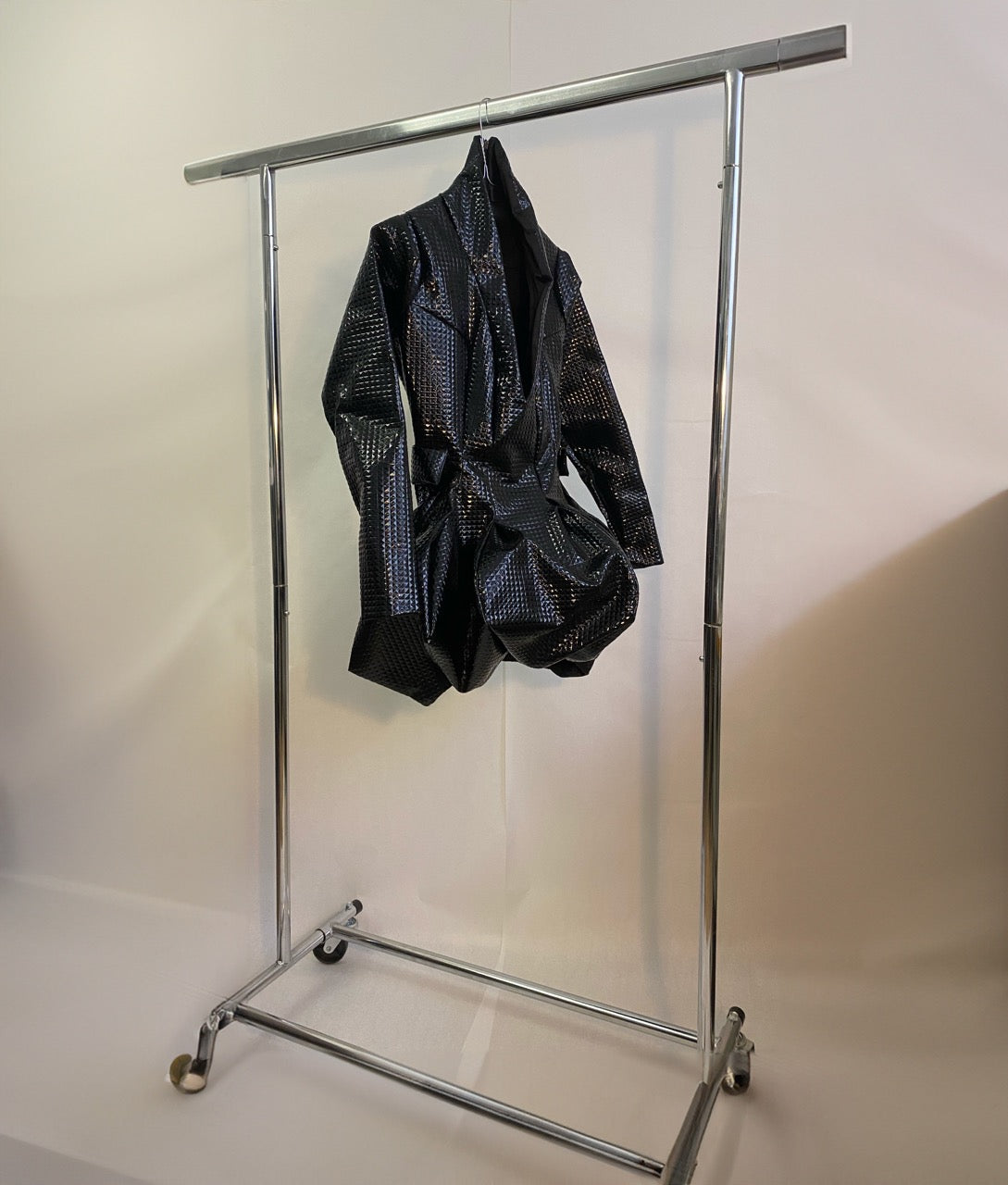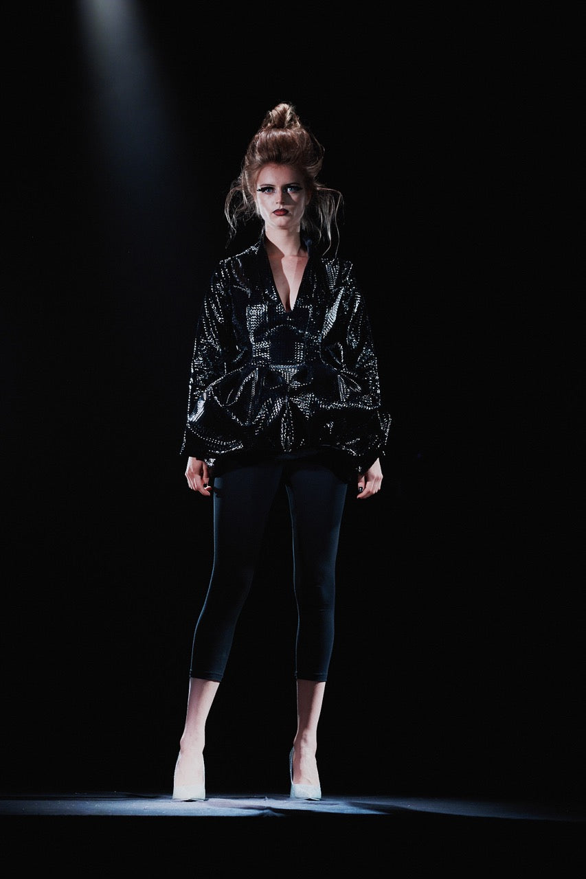 彫刻的なプリーツフロント、自立襟、尖った肩が特徴の黒のショーピースドレス。
