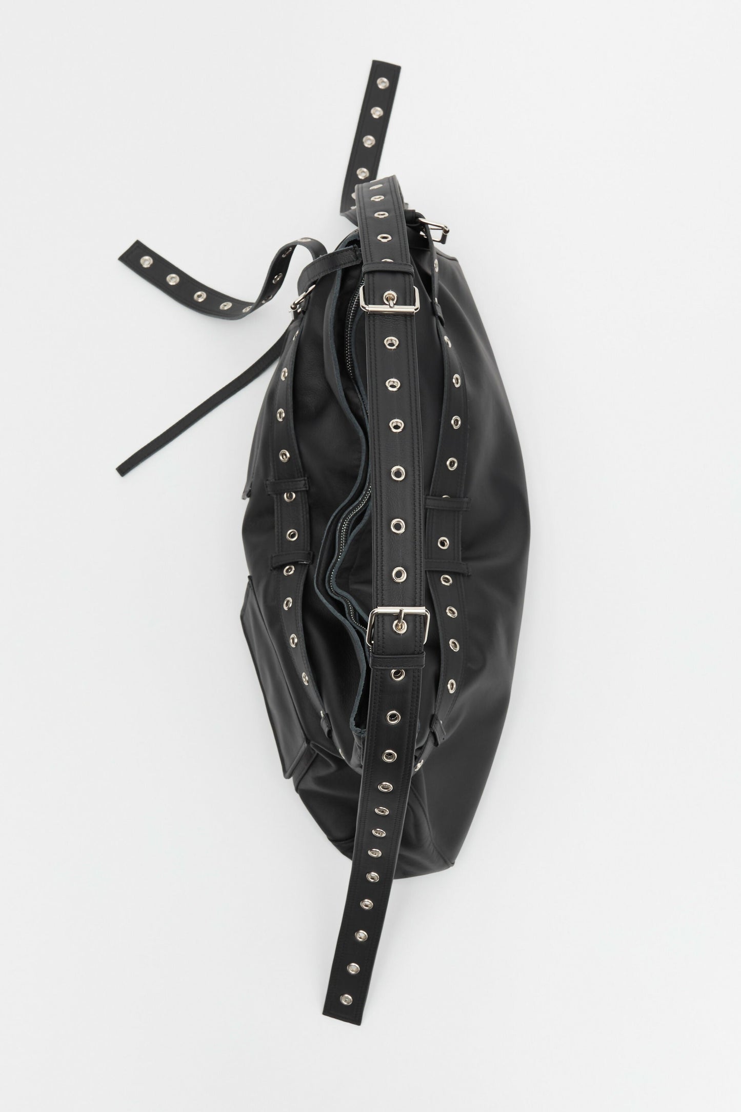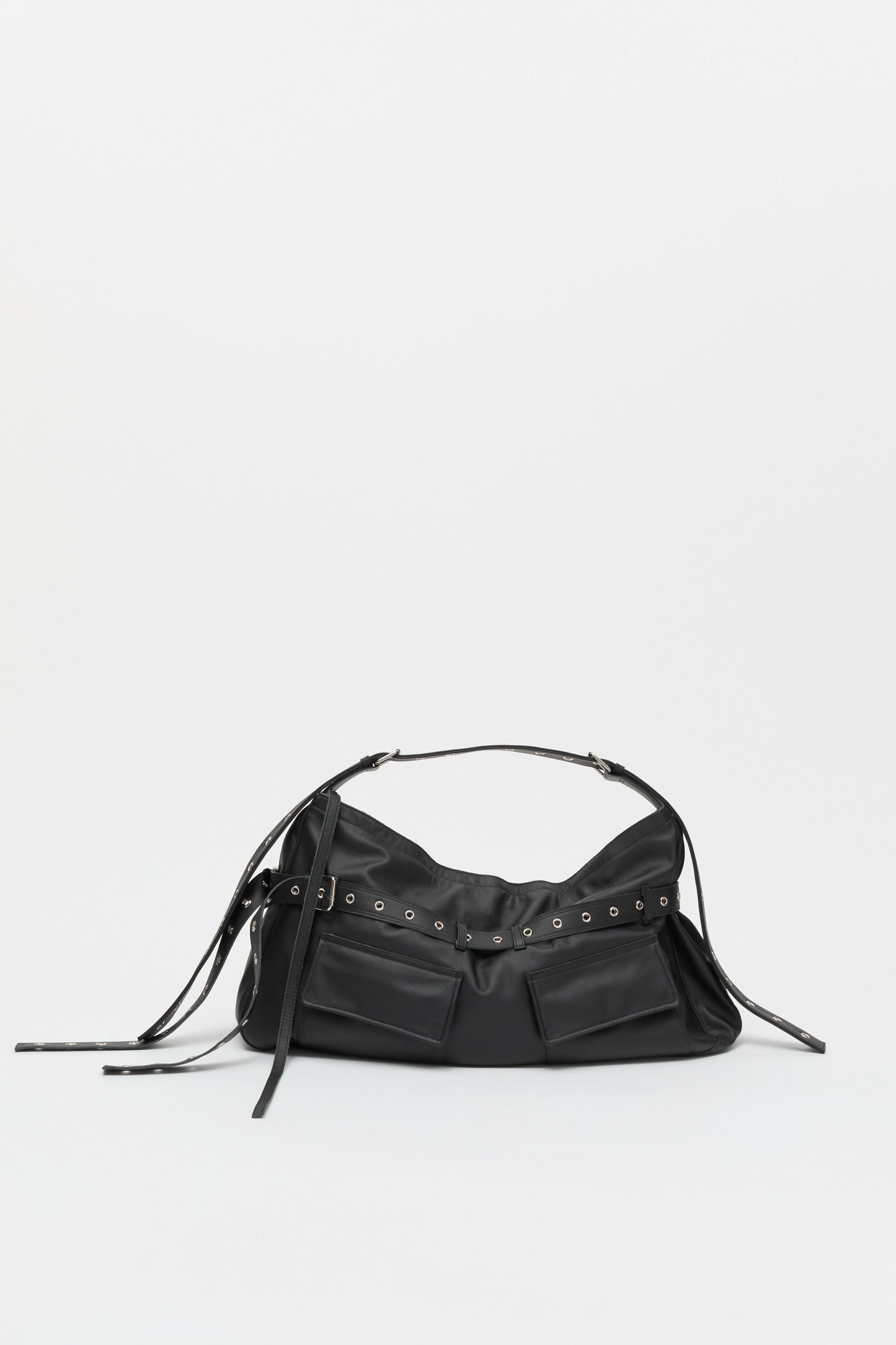 Taus signature oversized leather bag, designed with an adjustable shoulder strap, two exterior pockets, and a roomy interior compartment. Features a cinching belt with eyelet details for custom shaping and added edge.